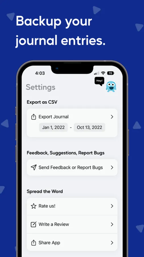 • Selected a range of dates and export your journal entries (text only) as a CSV.