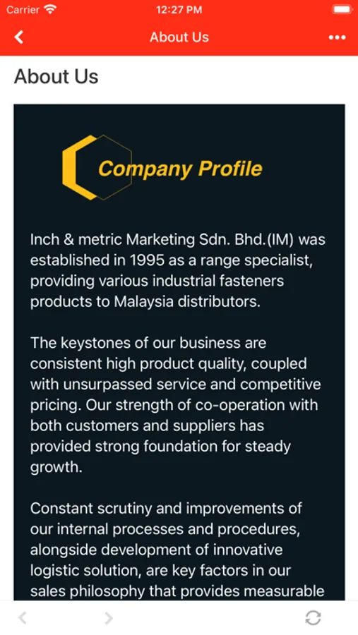 Inch & Metric Marketing Sdn. Bhd.(IM) was established in 1995 as a range specialist, providing various industrial fasteners products to Malaysia distributors.