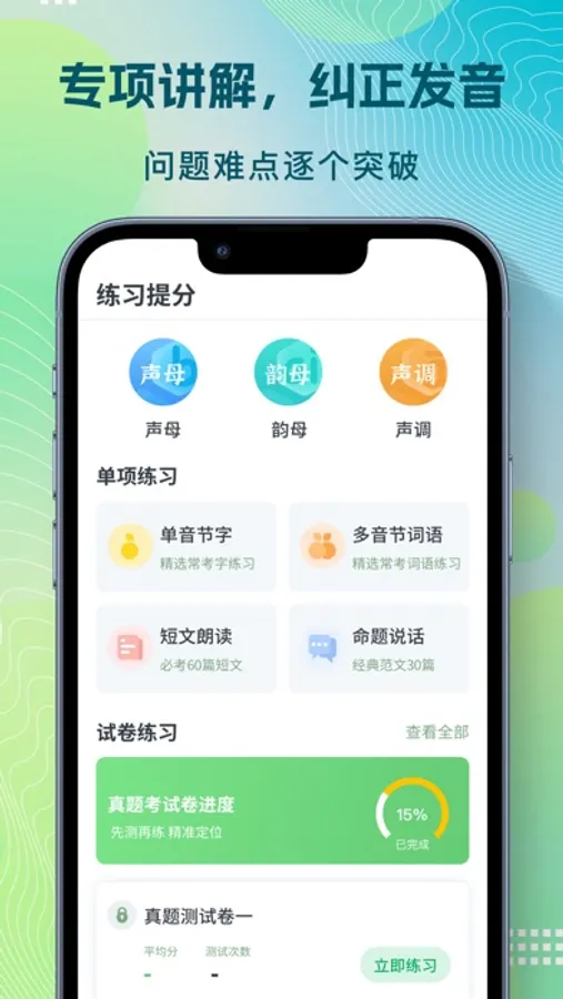 多套备考真题,科学高效备考,全真模拟考试系统,体验普通话水平考试完整流程,针对专项题型提供专项练习,问题难点逐个突破。