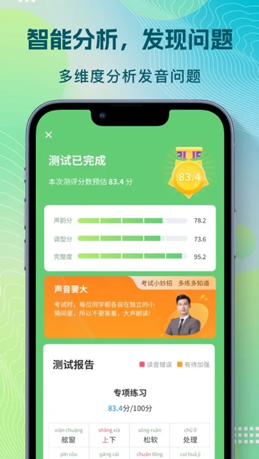 智能化分析,从声母、韵母、声调三方面分析发音问题,提供相对应的学习建议,通过记录用户练习情况,生成数据评估报告。推送适合用户的学习课程。