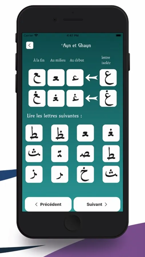 Familiariser l’apprenti avec les lettres de l’alphabet arabe. Il est composé de 13 leçons au total. De passer environ 5 minutes à 10 minutes pour l’étude de chacune d’elles, en vous aidant de l’enregistrement vocal (audio) qui vous est proposé afin de pouvoir de la bonne prononciation des lettres.