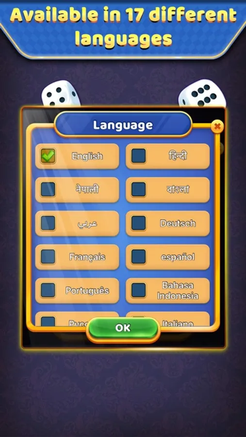English, Hindi, Nepali, Bengali, Indonesian, Spanish, Portuguese, French, Arabic, German, Russian, Italian, Thai, Japanese, Korean and Chinese languages are supported in this Ludo game.