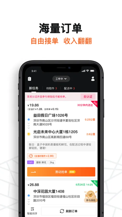 接单灵活,兼职配送员自由接单,入职专职合理派单。