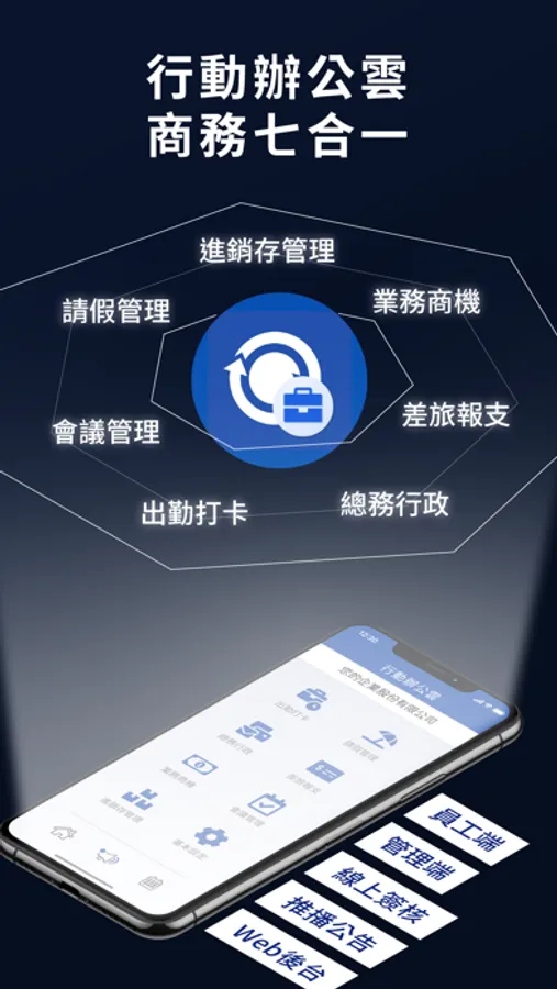 企業營運大小事,透過〖行動辦公雲〗App 的七個應用:出勤打卡、請假管理、進銷存管理、業務商機、差旅報支、總務行政、會議管理,一指搞定,讓企業營運辦公更高效、工作更簡單。