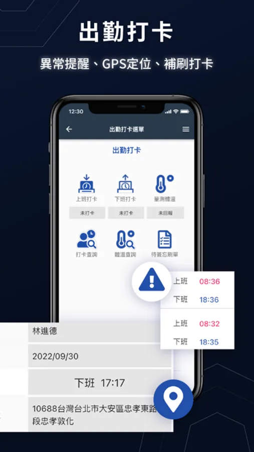 ► 提供員工每日上班、下班之出勤打卡及體溫量測回報,打卡紀錄含GPS地址資訊。