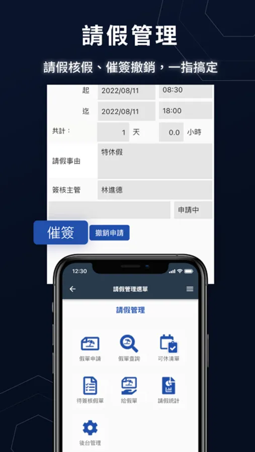► 提供員工請假申請之簽核進度追蹤及催簽功能。