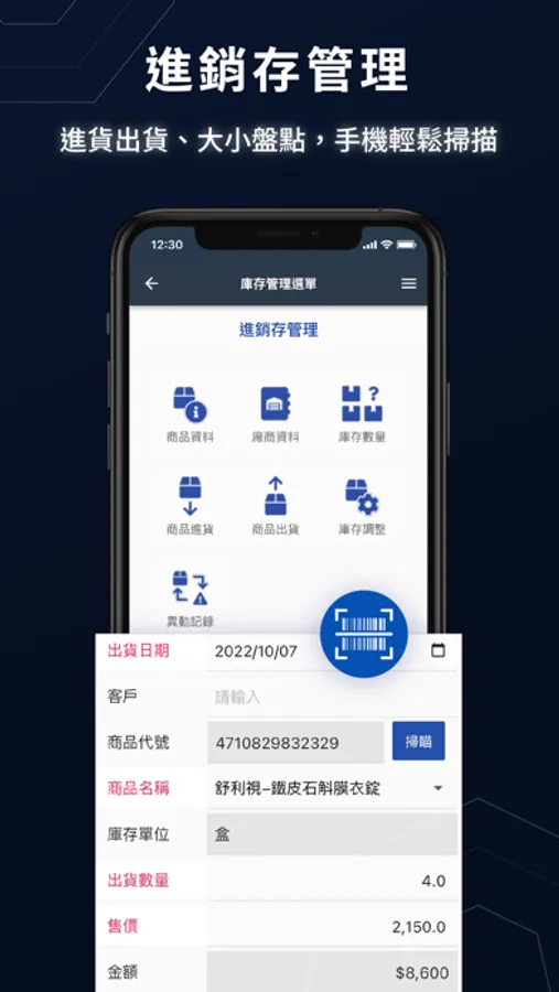 ► 支援手機掃商品條碼自動帶入商品代號及相關資料。