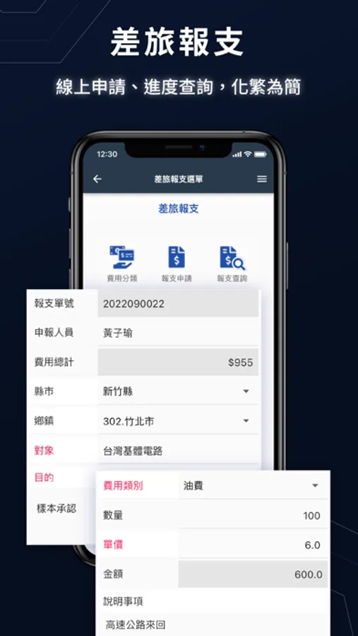 ► 提供員工以App進行差旅費用報支申請及查詢,預設常用報支費用下拉勾選超方便。