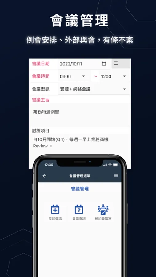 ► 提供以App快速發起新會議,同時預約會議室,會議行事曆可同步加到手機行事曆。