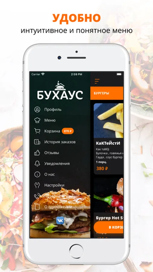 Бухаус — это удобный способ заказа еды домой или в офис! Мы готовим наши блюда из качественных свежих ингредиентов и доставляем еду быстро и бережно.