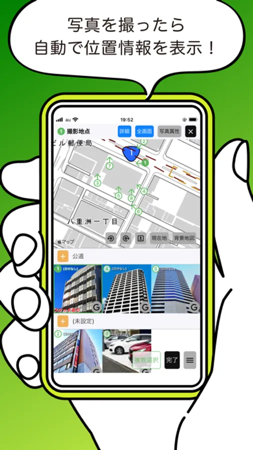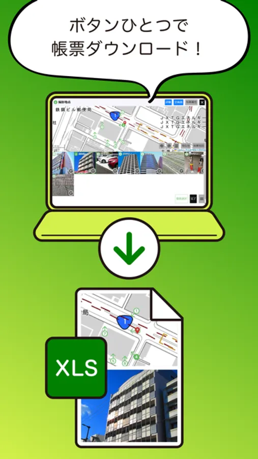 写真を撮影するだけで、撮影位置と撮影方向が地図上に自動で表示されます。帳票に載せたい情報は現場で入力することができ、ボタンひとつで帳票化が可能です。