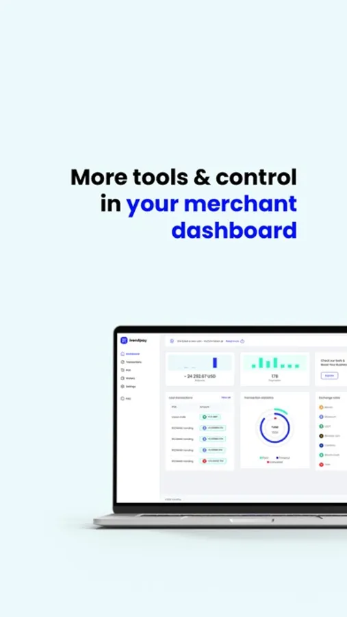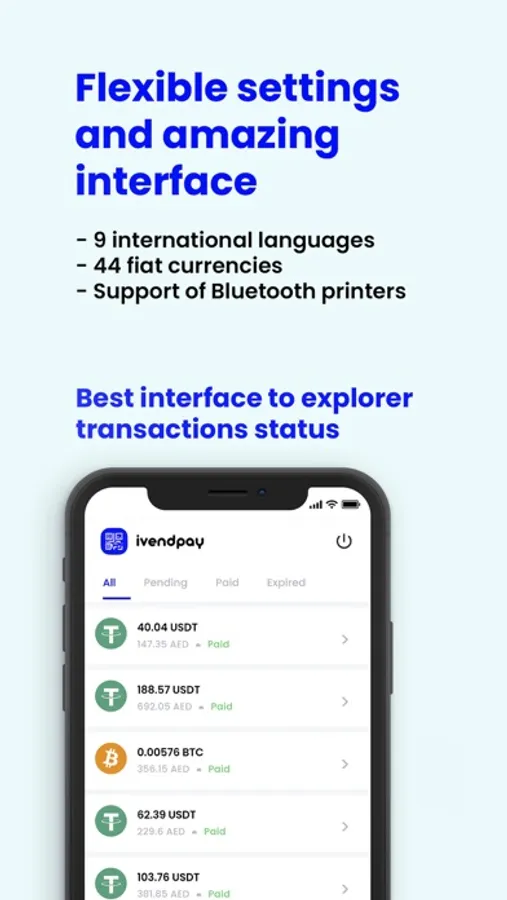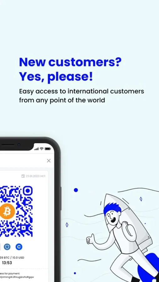Download a simple and user-friendly app to accept payments in more than 40 cryptocurrencies. As long as you’re connected to the internet, you can have a portable crypto PoS machine in your pocket!