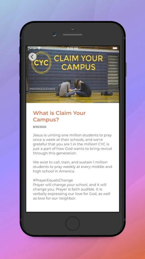 Claim Your Campus is uniting 1 million students on every middle and high school campus to pray for change. We aim to call, train, and sustain that movement of prayer through the Claim Your Campus app!