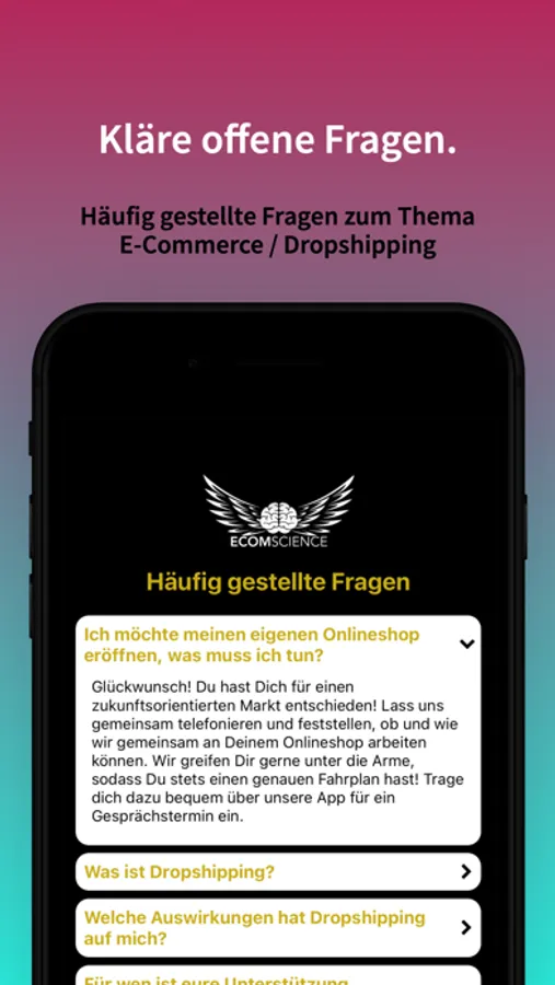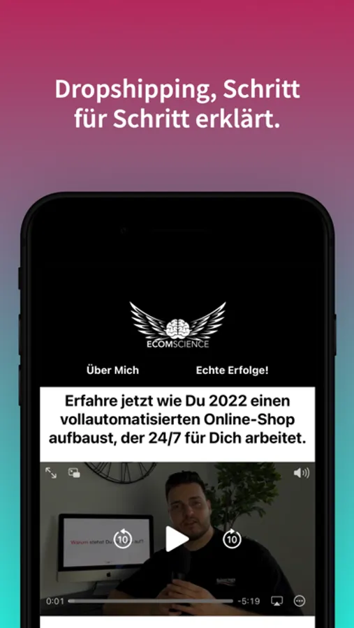 Durch diese App erlangst Du fundamentales Wissen, dass Du sofort umsetzen kannst, um Dir ein Standbein im E-Commerce / Dropshipping aufzubauen.