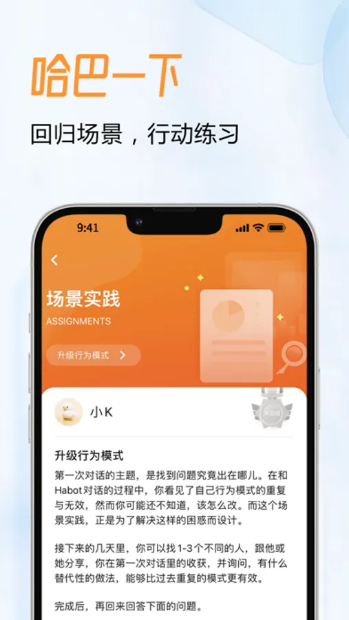 「哈巴一下」有系统化的集成工具,比如哈巴对话、哈巴冥想、场景实践等,来帮助你提升自己三个维度的能力。