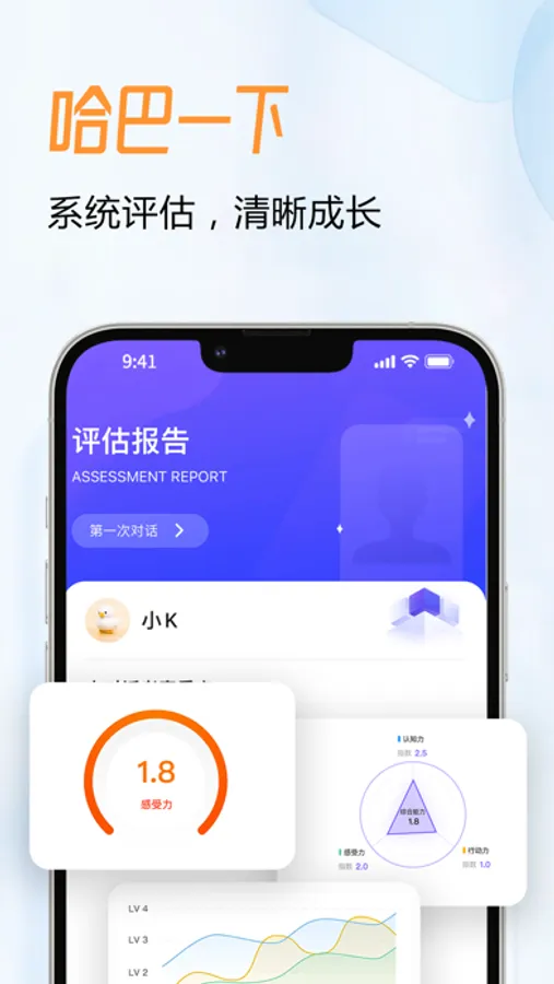 「哈巴一下」每一章学习内容,都有科学的数据采集,每次练习都会生成评估报告,你可以清晰看见自己的成长曲线。