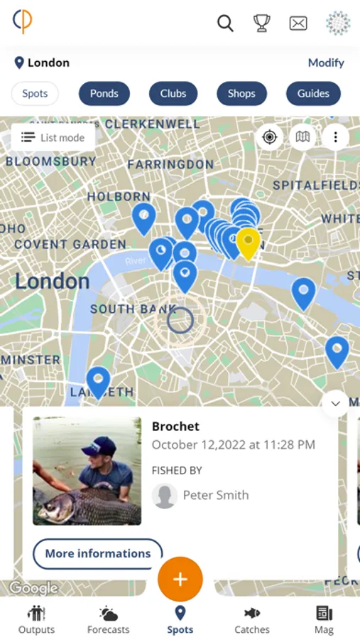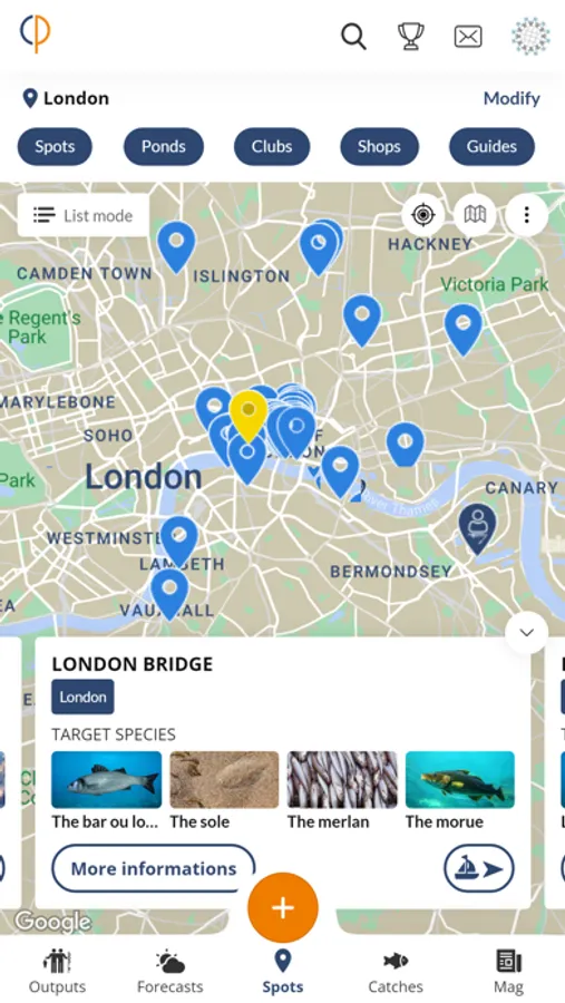 Our site gives access to more than hundred of thousand fishing spots in the word. Fishing on foot or by boat, save time to know where to fish right away. For each spot, we give you the GPS coordinates (wrecks, rocky plateaus, ...) as well as the species caught.