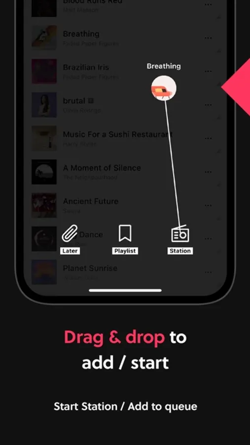 When you start a station from a song of your choice, a song based on that song will automatically be selected and played. You can start a station as soon as you press and hold a song or album and drag it to the station icon in the lower right corner. You can also start a station from the currently playing song.