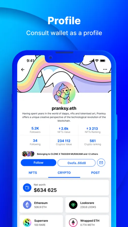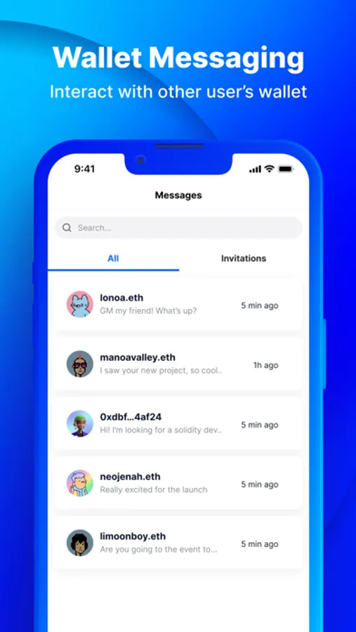 - Chat with your friends via instant messaging from wallet to wallet. Check out the collections you have in common with this person. No longer want to receive messages from this member? Block them. Interact between wallets has never been easier.