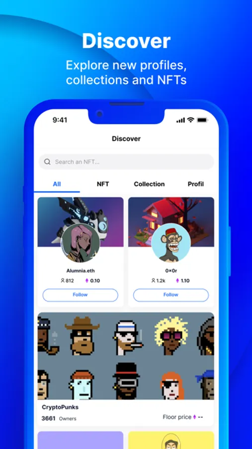 - Discover new profiles, new collections and new NFTs under the Discover tab. The world of NFTs is so vast that it is impossible to know about all the projects out there, which is why we wanted to give visibility to lesser-known collections. You can also use the search engine function to search directly for a member or collection.