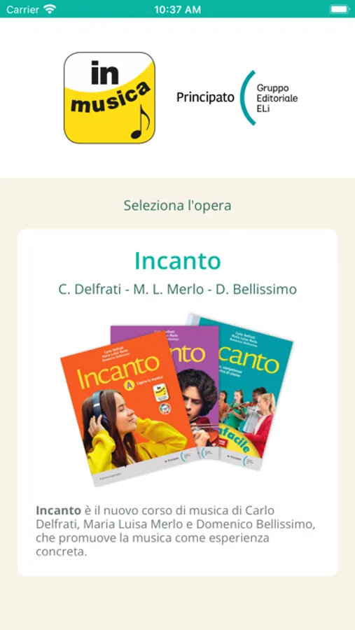 In musica è l’applicazione della casa editrice G. Principato abbinata ad Incanto, il nuovo corso di musica di Carlo Delfrati per la scuola secondaria di primo grado. L’app In musica permette all’utente di studiare le partiture musicali rappresentate su un pentagramma, illuminando le note e segnalandole con un cursore.