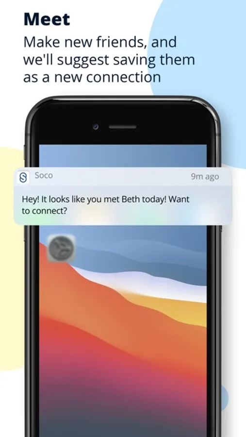 Soco uses ultra-close proximity technology to eliminate the need for the awkward exchange of contact information as you meet someone new. After meeting a new friend, Soco suggests staying connected to both users and gives both people the opportunity to approve or deny the connection. If both people confirm, either user can call or text the other person, or even save the new contact to their phone's contact app with a single tap. It's really that simple!