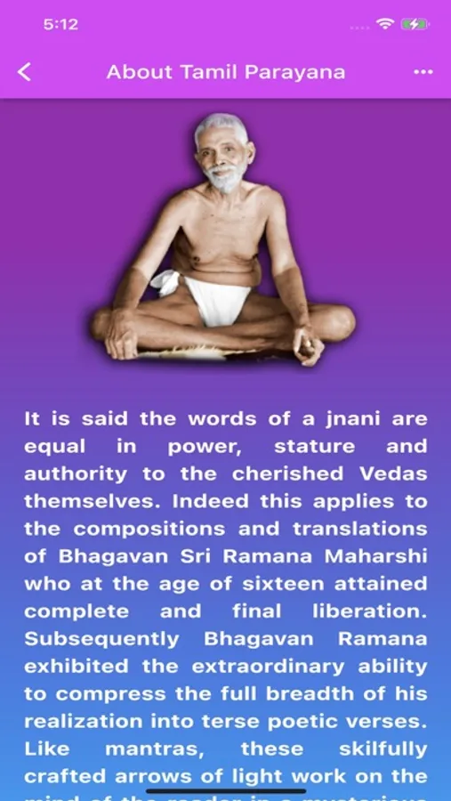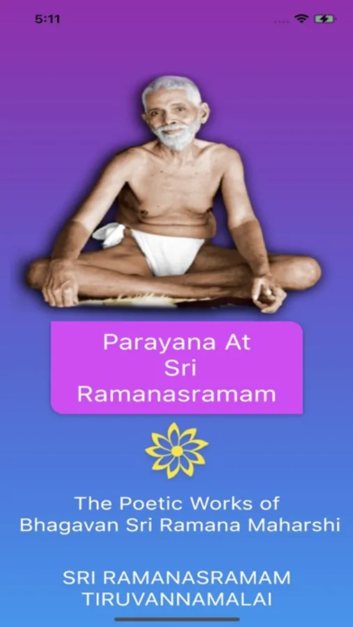 This app contains the parayana (chanting) of Tamil verses conducted daily at Sri Ramanasramam, Tiruvannamalai. The parayana are the poetic works of Sri Ramana Maharshi. The recitation of these works at Sri Ramanasramam started in 1920 and continues to the present day at the ashram. For the ease of the devotees, English transliterations of the verses are provided along with the original Tamil verses. Like mantras, these skillfully crafted verses work on the mind of the person in a mysterious and powerful way bestowing understanding and wisdom on the reader.