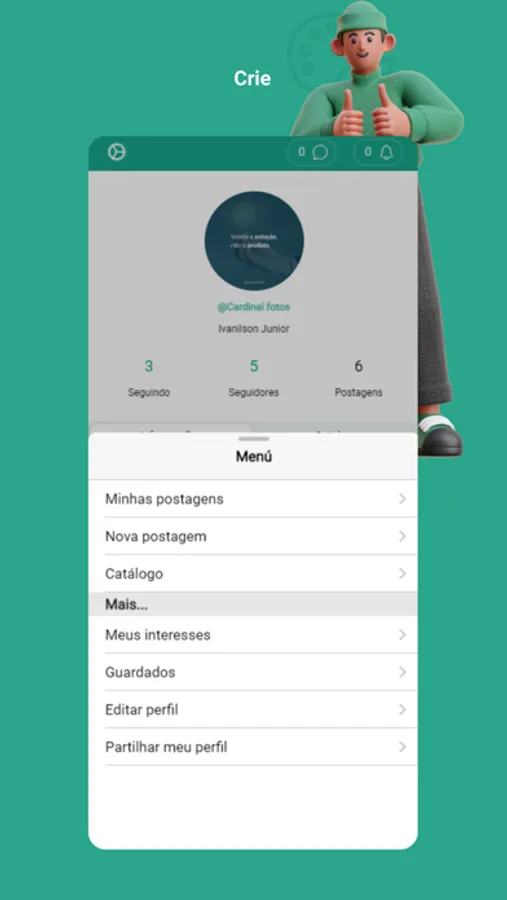 Crie um perfil, adicione suas informações pessoais e de contacto, personalize seus catálogos, crie links únicos para suas postagens e para o seu perfil e compartilhe com quem quiser.