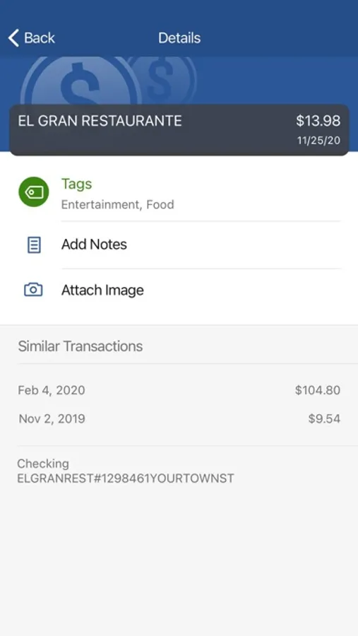 • Keep your transactions organized by allowing you to add tags, notes and photos of receipts and checks.