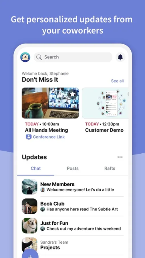 • We can find important information related to onboarding, HR processes, and product updates quickly in a centralized feed