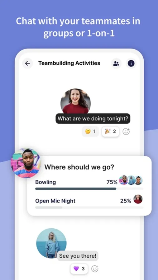 • We build community and culture with live chat, private groups, polls, team bonding activities, and more