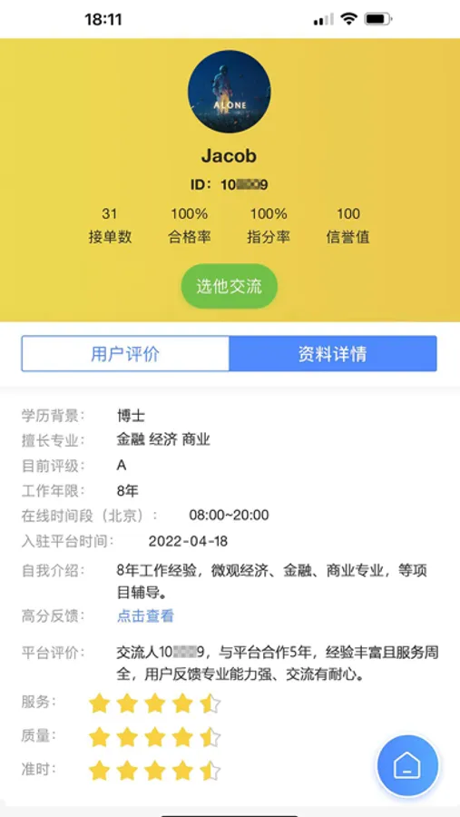 ESSAY官方是专为海外留学生提供学术交流的在线平台,旨在解决留学生在国外留学期间遇到的学术问题。代博士解决了海外学子在学术交流中找不到靠谱的专业人士,为求学术进取,严选专业人士入驻平台,保证双方利益,用户监督评价,共同提高平台质量及学术成果。