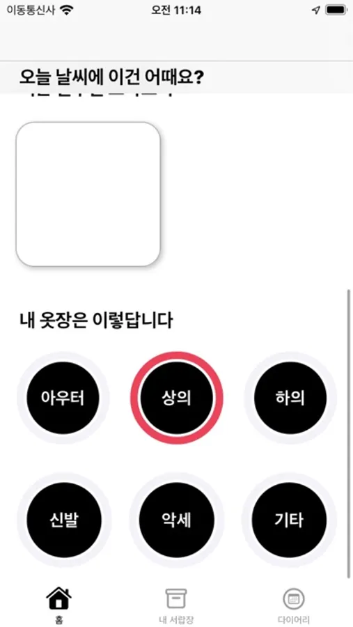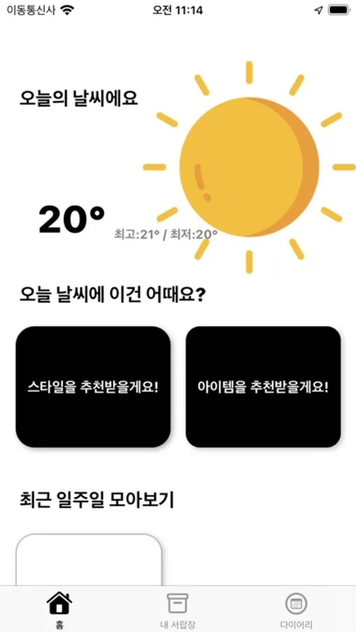 추가한 옷들로 나만의 일기를 작성하고, 선택한 날씨 태그에 맞는 아이템과 스타일을 추천받아 보세요!