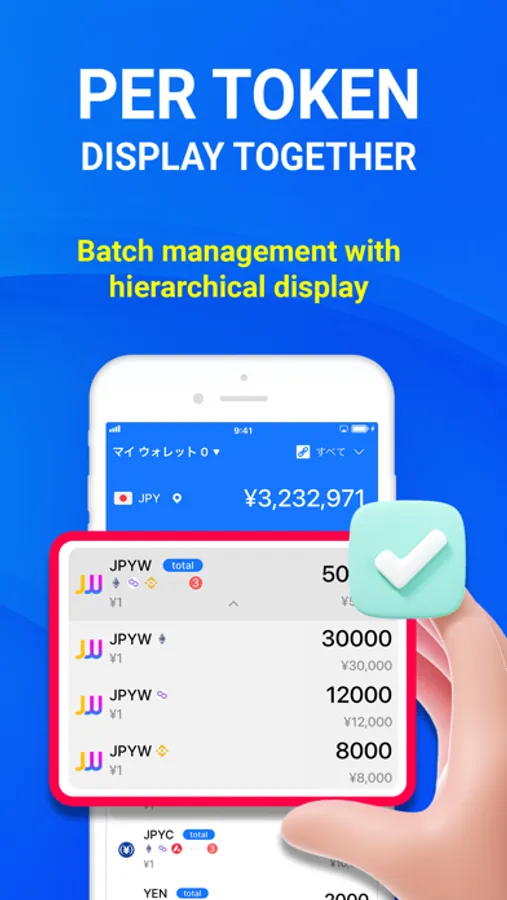 We adopted a hierarchical display different from traditional wallets. You can manage tokens in groups and also have detailed control on a blockchain-by-blockchain basis.