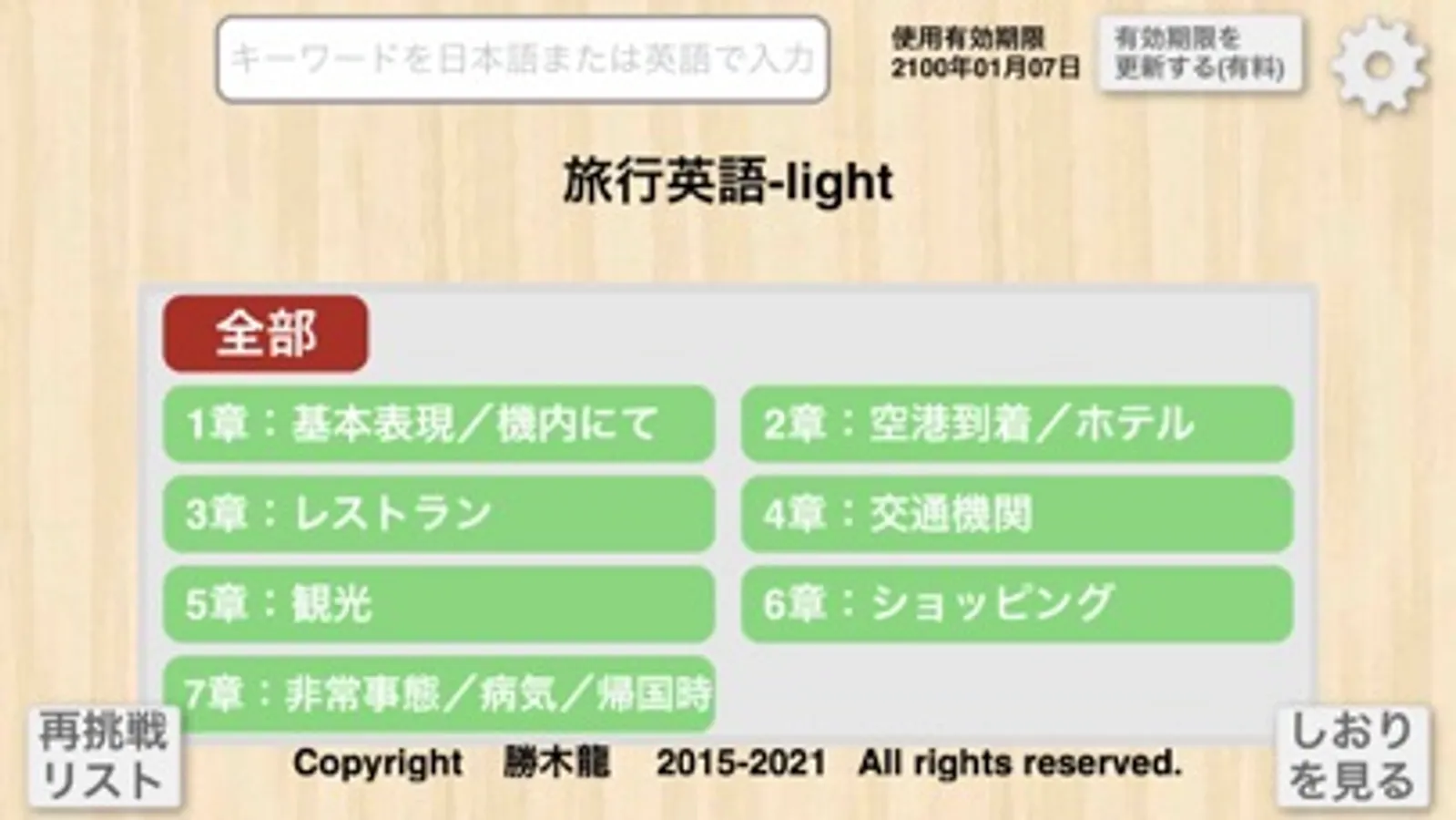 ・アプリの中に入っているフレーズを、日本語、または、英語のキーワードで検索することができます。