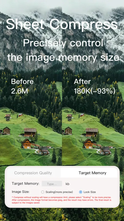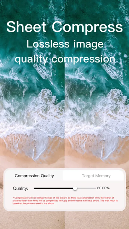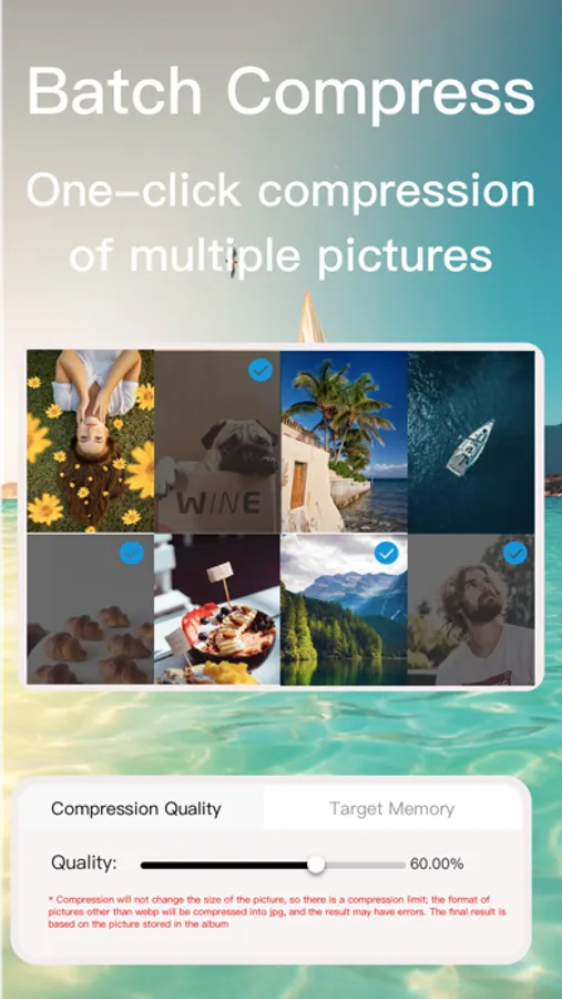 Photo compress is a one-stop photo compression tool that supports multiple image formats, which can meet your daily photo compression needs. The application supports batch compression operation modes for mainstream image formats such as PNG, JPG, WEBP, BMP, JEPG, and GIF, and can complete all images in batches with excellent efficiency. The steps of the compression function are simple and easy to operate, saving your time to the greatest extent, reducing your learning costs, and thus improving your work efficiency. The compression of GIF format pictures can freely adjust the frame rate and single frame market. Solve the problem that pictures take up a lot of mobile phone memory, and save valuable mobile phone space for you. Come and try it!