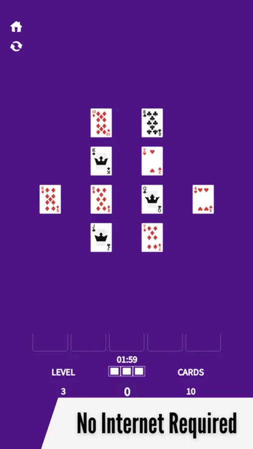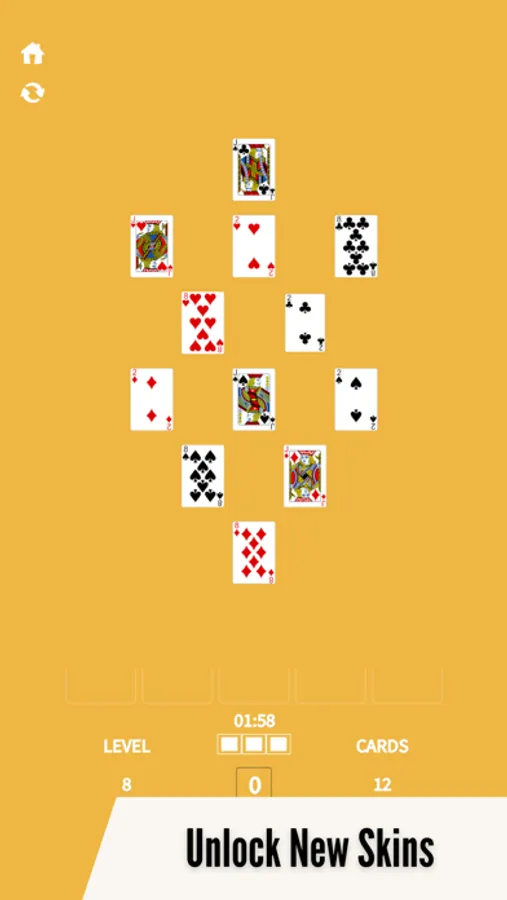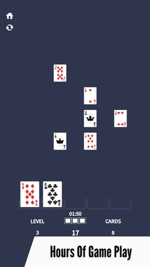 The objective of the game is to sort cards and sum up the score to 21 in each round to clear the board. But watch out for the timer and lives - a wrong move costs a life! Make strategic moves to clear levels and unlock new cards, floors, and tables.