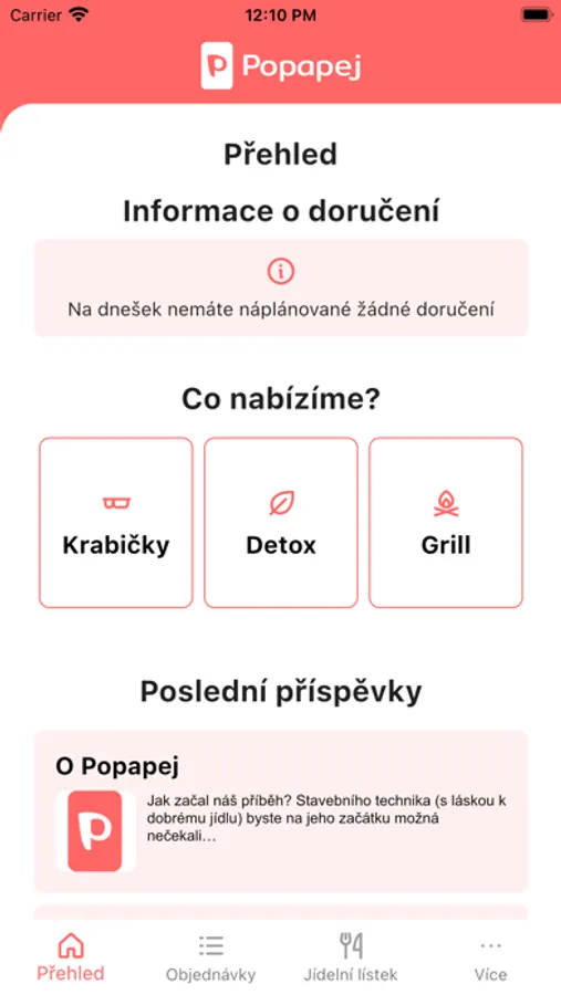 Po přihlášení do aplikace vás přivítá krátký průvodce, který vám pomůže nastavit všechny užitečné notifikace týkající se každodenního doručování objednávek, stavu faktur i novinek v aplikaci nebo nabídce Popapej. Povolit si také můžete přihlašování pomocí biometrických údajů. Na úvodní stránce vás poté bude čekat ještě několik užitečných informací, včetně odpovědí na nejčastější otázky ohledně doručování krabiček nebo jejich dočasného odhlašování.