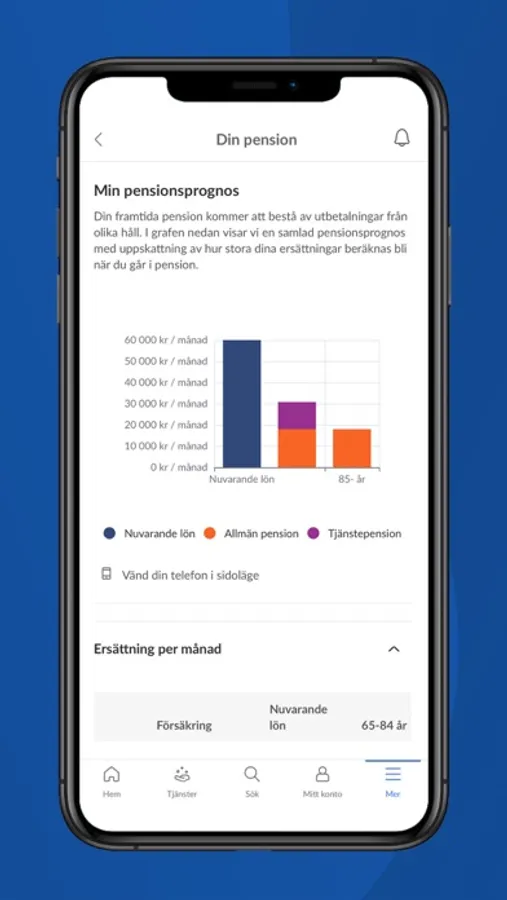 - Under Pensionsprognos visas en samlad pensionsprognos med en uppskattning av hur stora dina ersättningar beräknas bli när du går i pension. Du kan även simulera ditt pensionsuttag och laborera med hur sparande, pensionsålder och utbetalningstider kan komma att påverka din pension.
