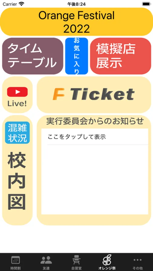 このアプリでは文化祭の公演項目、模擬店の場所を校内図に当てはめて見やすくまとめたもの、また校内の混み具合、チケットの管理などができます。