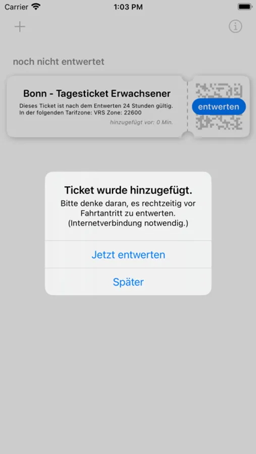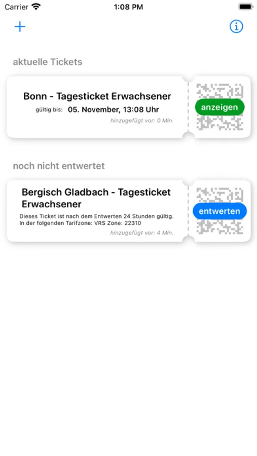 Bus und Bahn Tickets die du in Hotels, für Konzerte oder ähnliches gekauft hast, kannst du in dieser App verwalten, entwerten und während einer Fahrkartenkontrolle vorzeigen.
