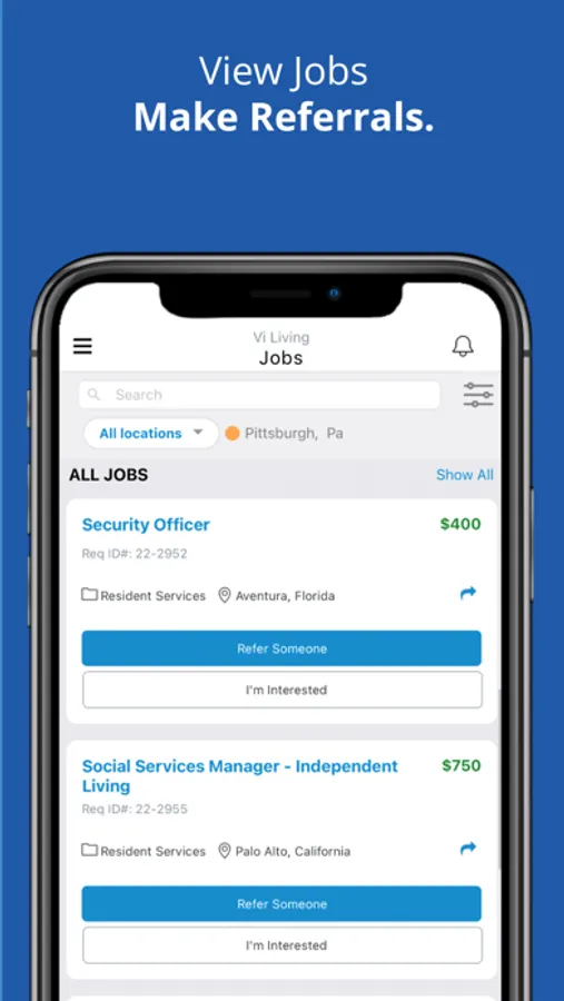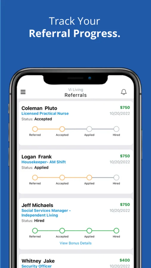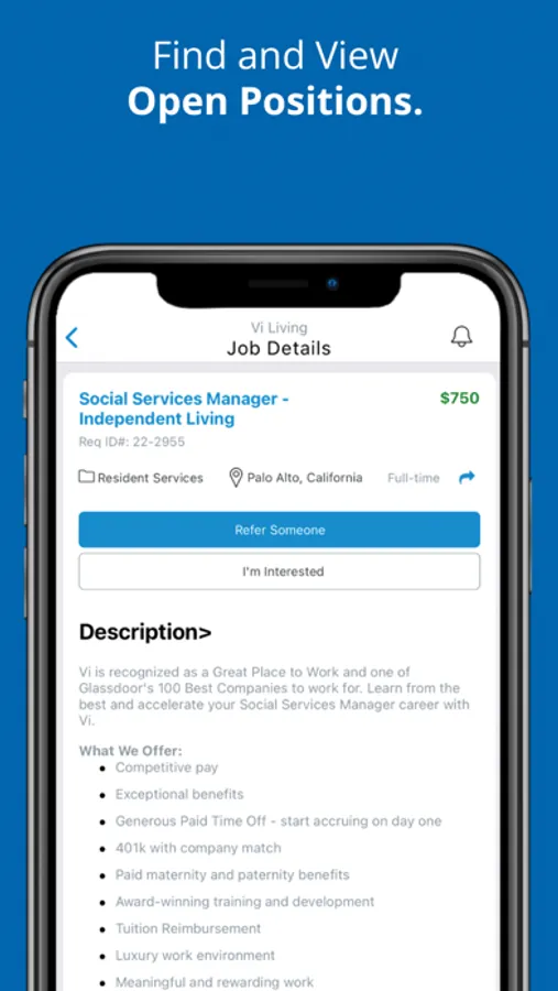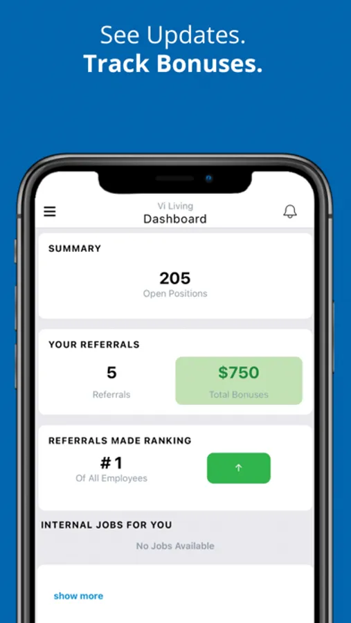 Vi’s Talent Scout app gives users the ability to refer friends and family as well as easily share open jobs on their social media accounts. Vi employees can view internal job opportunities across all our locations and apply directly for them. The app gives users visibility into the status of their referrals, the number of points they’ve earned and when referral bonuses are expected to be paid.