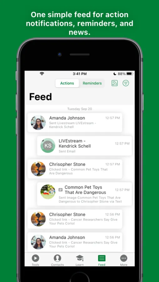 Contacts: Choose how to sync and manage your contacts. Swipe to sort them by interest level. You can make connections, add notes, or check out the Contact Feed to see the tools you’ve shared and contact actions.