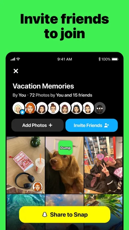 Dump is a new app to easily create and share photo albums with friends on Snapchat, Instagram and WhatsApp!