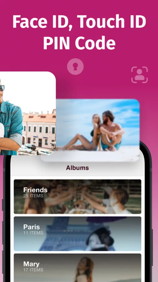 Create private albums that only you can access. Your secret photos are protected with a PIN code/FaceID/TouchID that keeps intruders away.