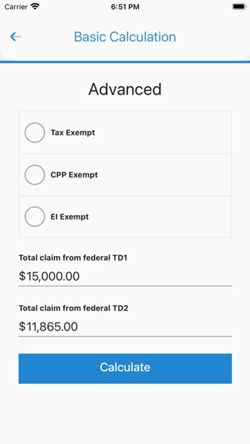 The app handles advanced scenarios like tax exemption, CPP exemption and EI exemption. Calculate pay outs for many different frequencies - annual, quarterly, monthly, bi-weekly, semi-monthly, weekly and even special cases like 10, 13 or 22 pays per year.