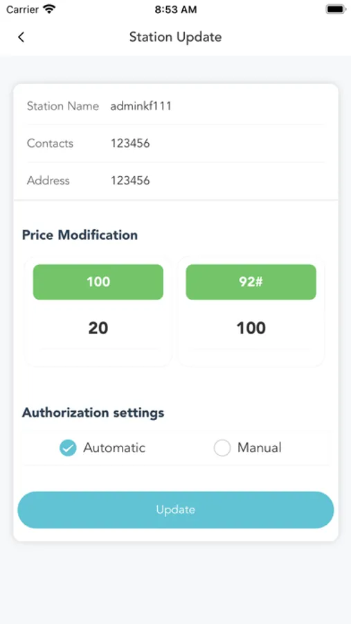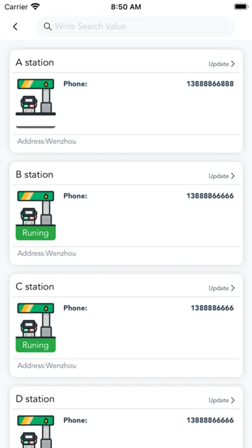 It includes 11 main functions: gas station, real-time fuel tank, exception, real-time data, refueling record, storage record, gas station report, data summary, employee, discount and point