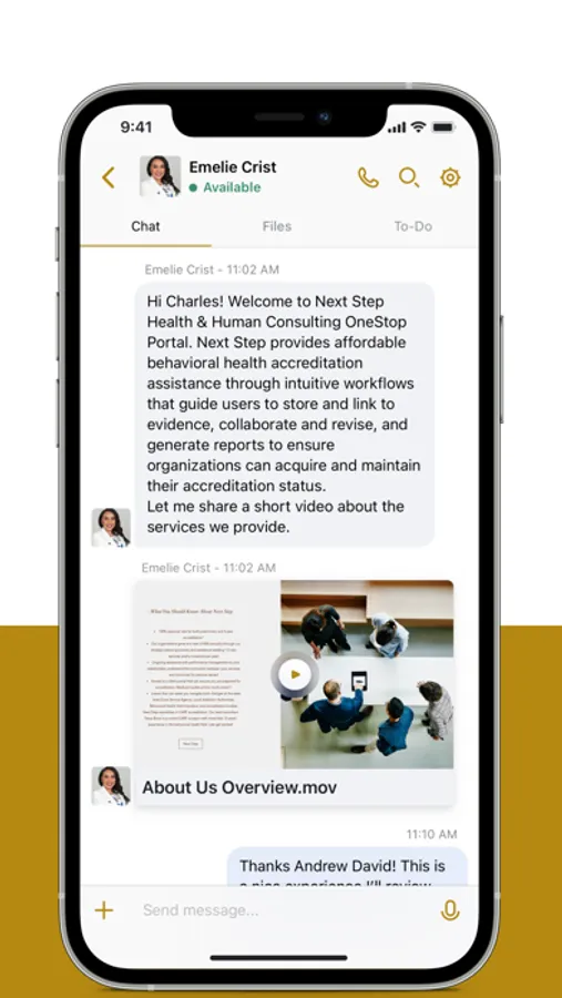 The Next Step app streamlines the accreditation process from end-end. With capabilities like secure messaging, video meetings, document sharing, calendar management, and more, our app provides a private consulting experience at your fingertips.