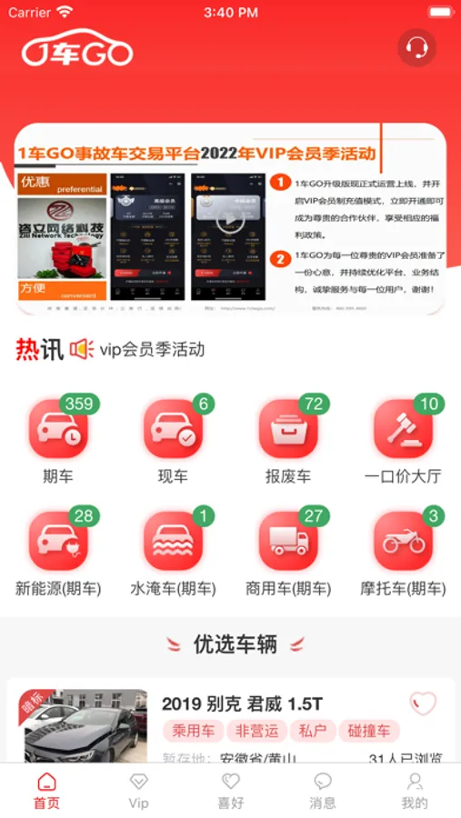 1车GO致力于保险损余物资、事故车、二手车、定制化拍卖以及拆车件资源服务的专业网络平台,旗下拥有两家专业拍卖公司及标准化的网络拍卖平台。秉持着专业、高效、共赢的经营理念,咨立网络科技搭建了完善的损余物资拍卖业务体系,包括快速的网点建设、标准的业务流程、集中的损余物资、车辆现场保全、创新的网拍模式、全面的服务支持,为委托人提供完善的车辆处置方案,为竞买人提供新型的商业盈利模式。
