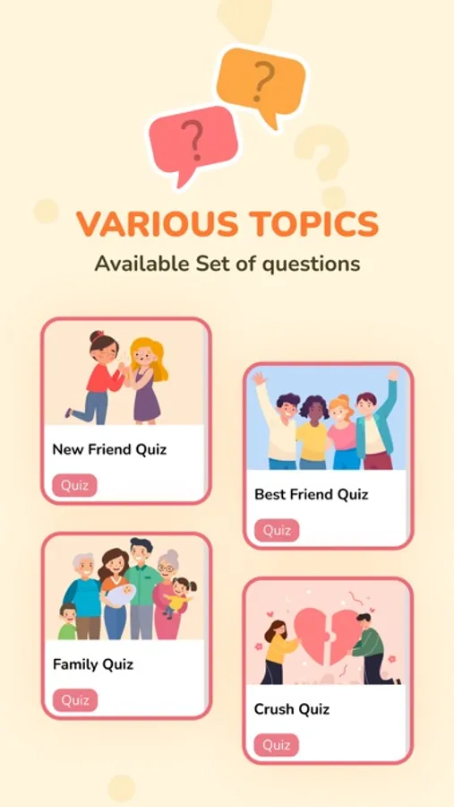 Navigating QuestMe is easy! Just open the app and press the "Create Question" button. You will be provided with many themes to choose from, including love, lover, best friend, new acquaintance and family. Each category already contains many pre-made questions, but you can easily modify them, adding new questions, images and answers to make them your own.